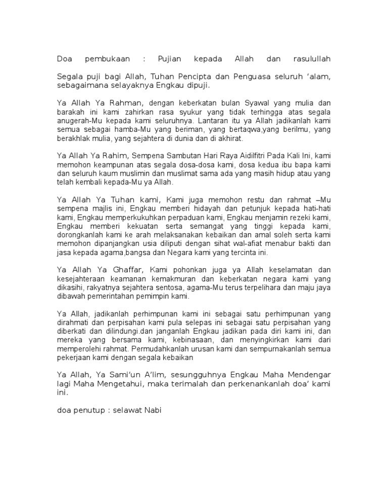 DOA Hadirin-hadirat yang dihormati sekalian Majlis sambutan hari raya Aidilfitri ini kita mulakan dengan munajat doa memohon restu dari yang maha Esa. Doa Sempena Sambutan Hari Raya Aidilfitri Pdf. 12 Doa Hari Raya Aidilfitri Bulan Syawal.